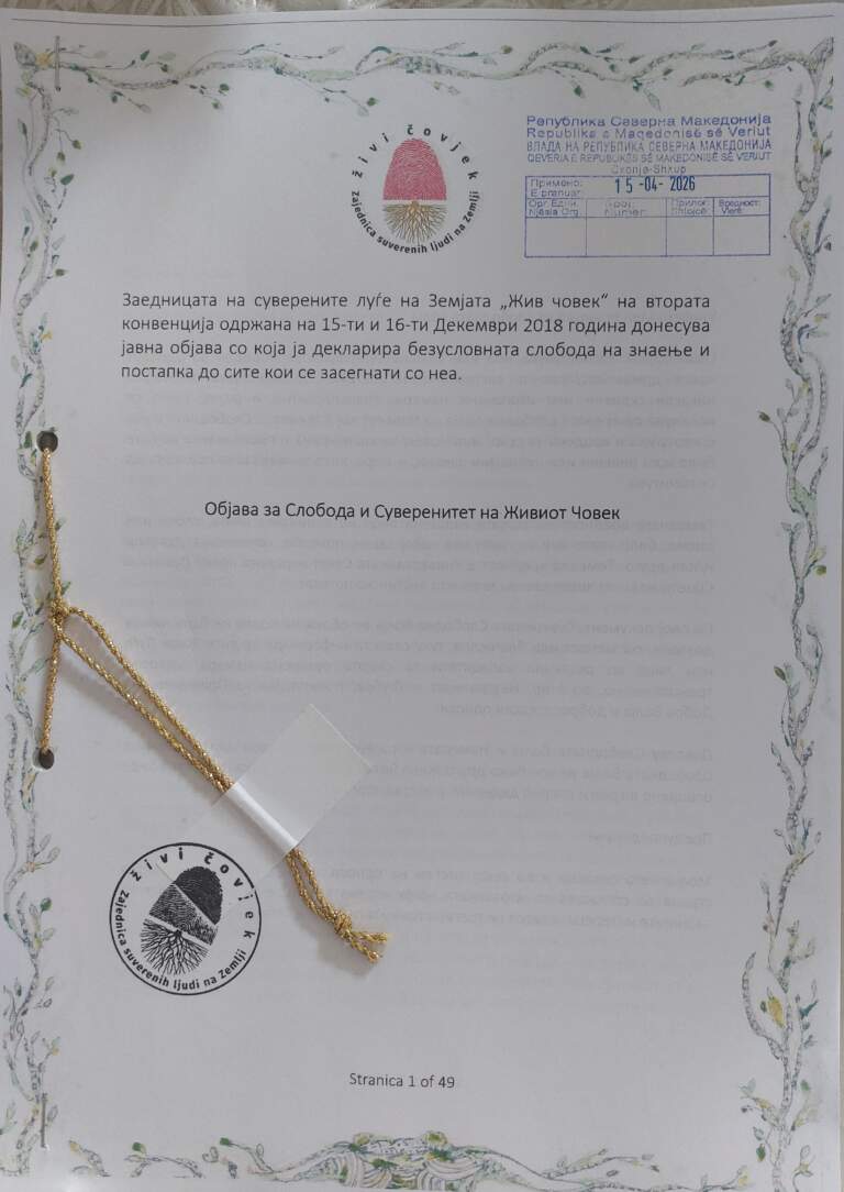 Na današnji dan uručena je “Objava slobode i suvereniteta živog čovjeka” svim relevantnim institucijama korporacije REPUBLIKA SEVERNA MAKEDONIJA, od sada svi ljudi sa tog fiktivnog administrativnog područja na našoj Majci Zemlji imaju mogućnost priključiti se našoj Zajednici. Svi vi koji ste spremni za takav korak javite nam se na mail info@zivicovjek.org i dobiti ćete upute. Dobro nam došli!